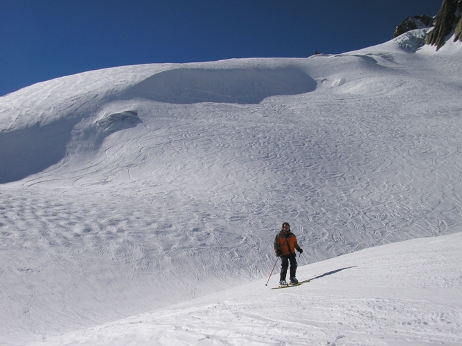 Raggiunto l'itinerario dell'Aguille du Midi, la neve cambia e iniziano le prime gobbe.