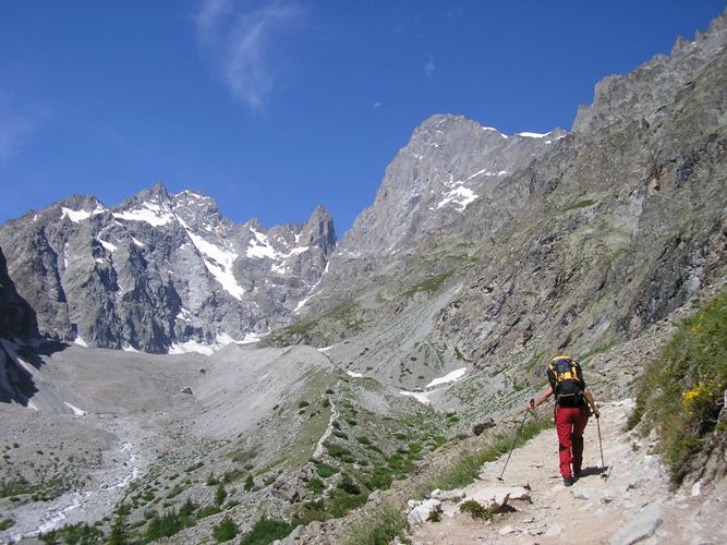 Si parte, sullo sfondo la parete sud della Barre des Ecrins.