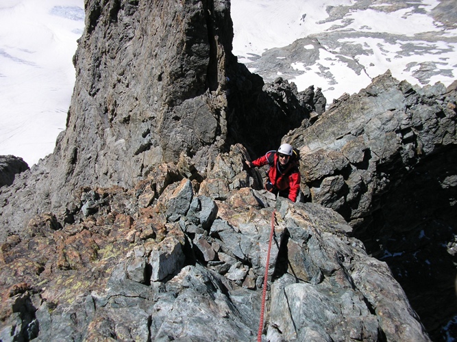 Seguendo il filo di cresta ci sono due divertenti salti verticali, qui Marco esce dal primo.