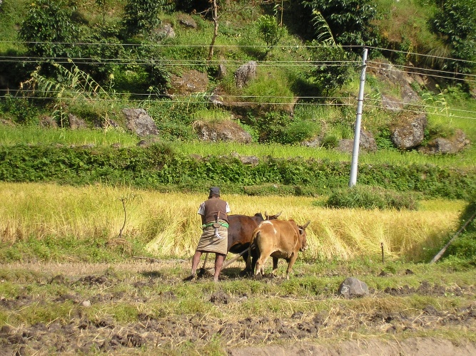 Un agricoltore Namrung ara i campi.