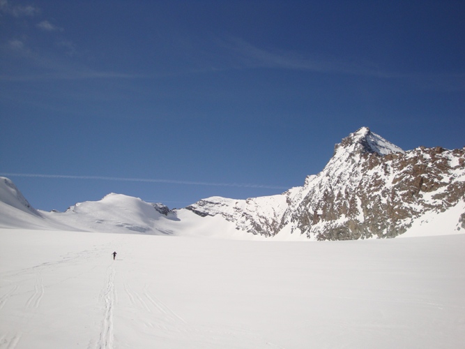 Sul ghiacciaio, sullo sfondo la punta nera e a destra la Grivola.