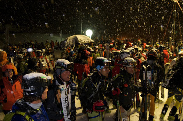 Alle 5:30 in partenza a Cervinia sotto la fitta nevicata (foto arc. trofeo Mezzalama).