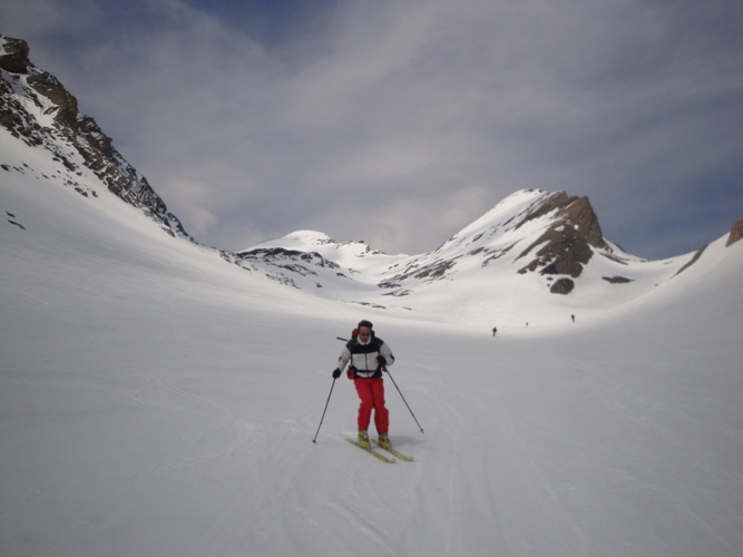 Paolo in discesa sulla bella neve trasformata sopra il lago di Goleon.