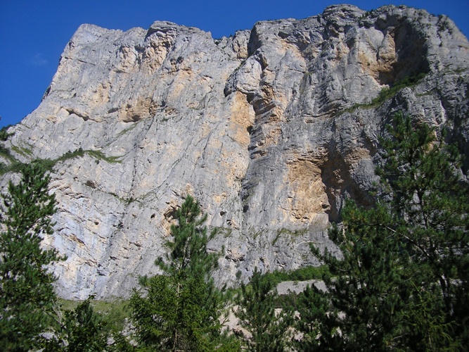 La parete di Les Gillardes, la via attacca a destra del grande diedro mediano.