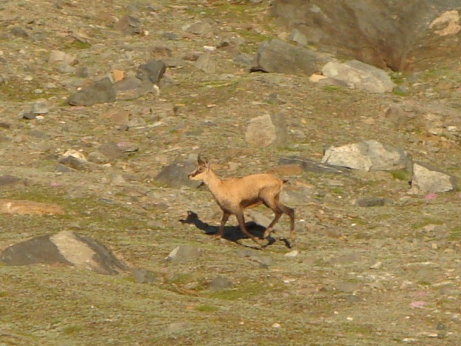 Un camoscio corre illuminato dalle prime luci del mattino.