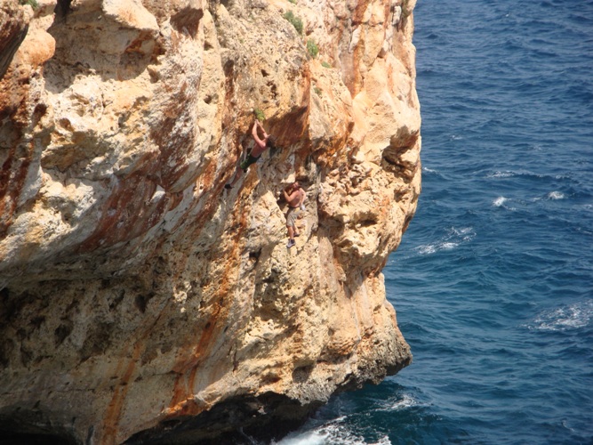 Andrea sullo strapiombo di un 6b+ alla Cueva, Giovanni osserva preoccupato...