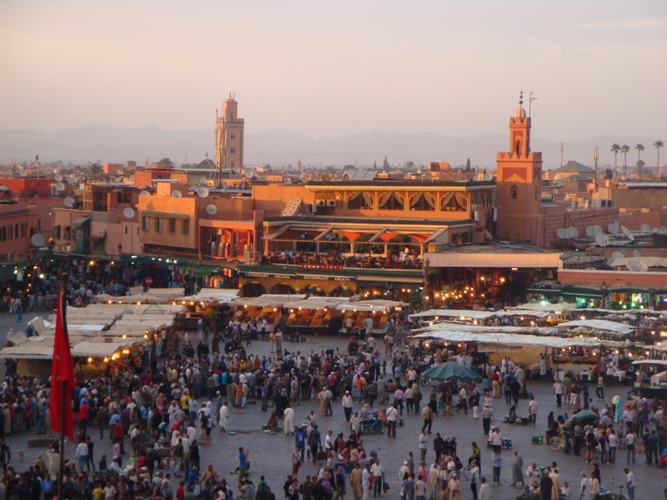 La piazza di Marrakech con le sue bancarelle e i ristoranti a cielo aperto.