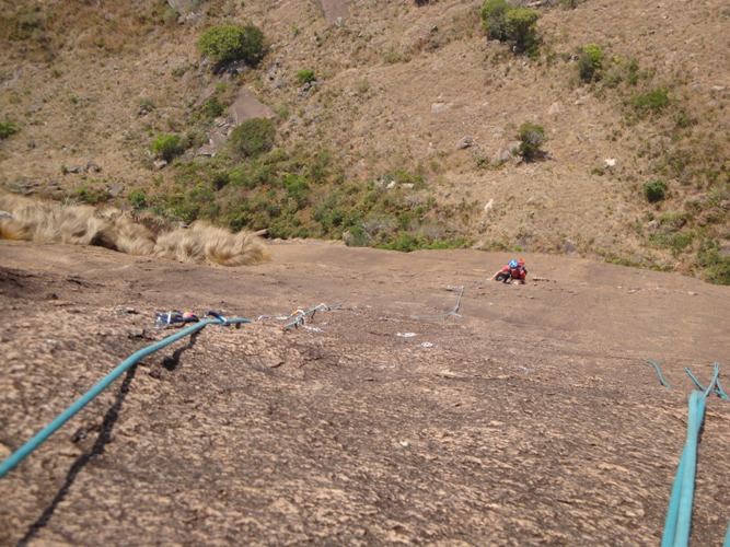 Il secondo tiro di Tsaradonga: una successione incredibili di tacche e knobs per 50m (7a).