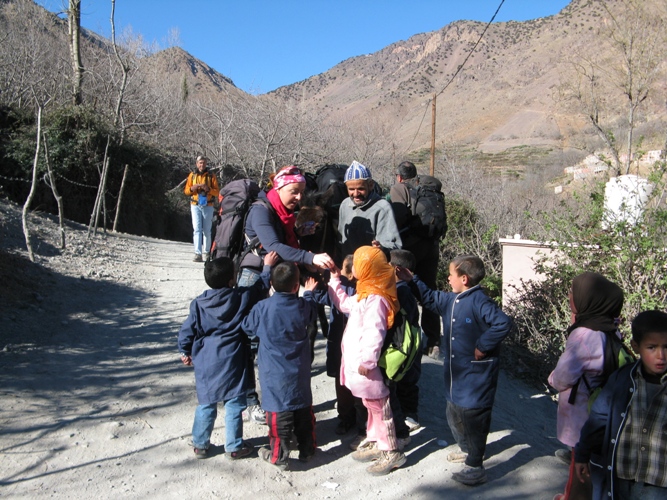 Distribuzione di bon bon agli scolaretti di Imlil.