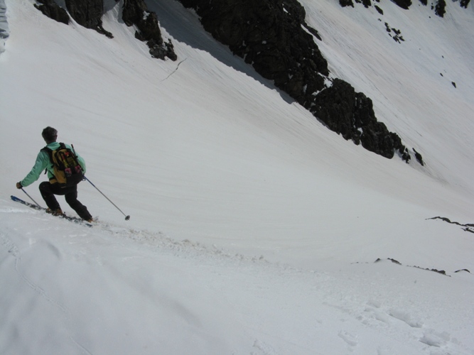 La discesa nel versante sud del Tizi n'Ouagane (3750m) su neve vellutata.