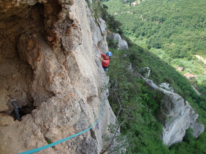 Il traverso dalla Grimonet verso la sosta del secondo tiro della via.