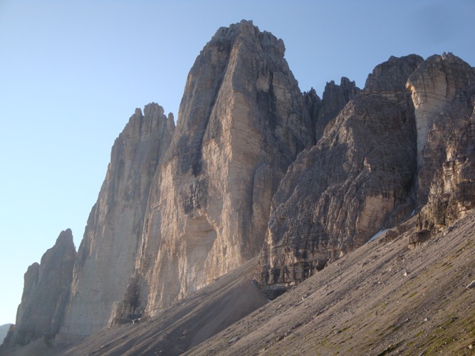 Le pareti nord delle tre cime di Lavaredo, la via di Cassin parte sullo spigolo a destra dei grandi strapiombi.