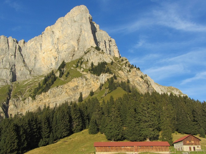 La parete della Croix de Fer vista dai prati sopra il rifugio du Veran.