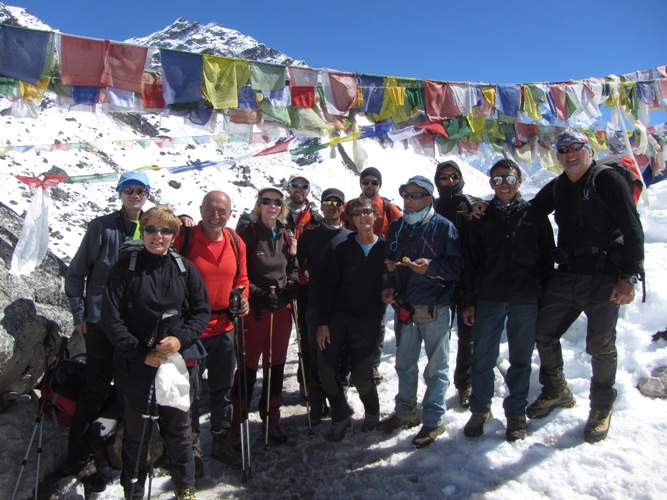 Gruppone sotto le bandiere di preghiera.