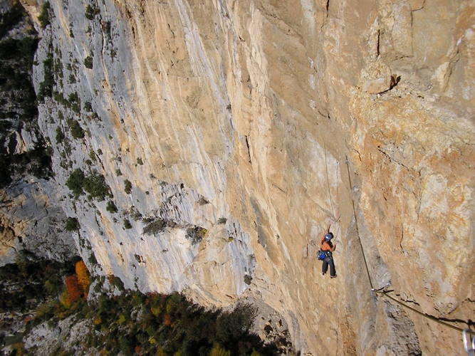 L5: 7a, tiro in forte esposizione e con l'unico passo obbligatorio della via,